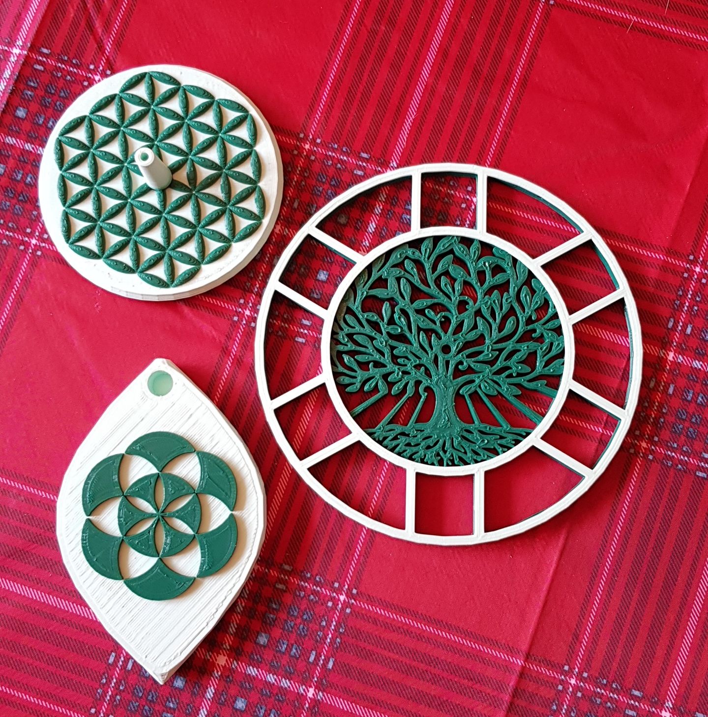 Sur une base d'Arbre, Fleur et Graine de Vie, vert pâle et vert sapin,